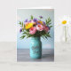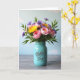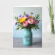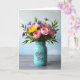 Designed with a springtime still-life feel, this card shows a full bouquet of soft pink, sunny yellow, and light purple flowers nestled among fresh green leaves ❤️. Some blooms look tightly layered and rounded, while others open wide with simple petal rings, giving the arrangement a friendly, close-together look like a gentle hug. The flowers sit in a smooth teal glass jar that steadies the scene and adds a cool contrast to the warm petals. Near the center of the jar, the words “Mother’s Day” appear in a flowing, cursive-style lettering, slightly raised and easy to spot. The arrangement rests on a pale wooden surface where the subtle grain lines run quietly beneath the jar. Above it, a calm sky-blue background and soft lighting make the petals look tender and freshly placed, like a thoughtful gesture shared between loved ones 🌼. Faint, airy cloud shapes drift across the upper background in a lighter blue tone.