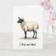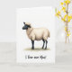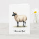 This card features a stylized sheep centered on a plain white background, shown in side view with its wide eye looking gently to the left as if noticing someone nearby ❤️. Its fleece is drawn as creamy, wavy tufts that look soft to the touch, contrasting with a smooth dark gray face, pointed ears, and slim legs. A faint warm shadow sits under its hooves, giving the figure a grounded, cozy presence without adding clutter. The sheep’s calm posture and tender expression suggest affectionate attention, like a quiet moment shared with someone special. Beneath the animal, a casual hand-lettered line reads “I love ewe Maa!” in dark gray text, placed low and centered with comfortable spacing. Soft shading and small highlights add depth to the fleece and face while keeping the overall look simple and airy 🌼. The white space around the sheep makes the creamy wool and dark features stand out clearly, with the punny message sitting just below the hooves.