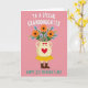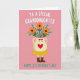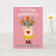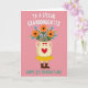 This card shows an illustrated, human-like flower arrangement set against a soft pink background, with a cozy, affectionate mood ❤️. In the center sits a round, cream-colored vase with small handles, tied at the neck with a bright red bow that feels like a sweet hug. A shiny red heart emblem is placed on the vase’s front, giving it the look of a character offering love without saying a word. A full bouquet rises from the top, led by orange daisy-style blooms with deep, dark centers, mixed with tiny sky-blue and pale yellow flowers among leafy green stems 🌼. Below, the vase “wears” a sunny yellow skirt dotted with small white polka dots, adding a friendly, flirty touch. A pair of sturdy brown boots at the base makes the character feel grounded, like it’s standing there waiting to be noticed. At the top, crisp white text is centered as a short dedication, while a clear teal line of text sits near the bottom to note the occasion. The heart emblem is glossy red, and the bow’s tails curve neatly along the vase.