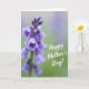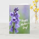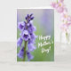 The front design shows a close-up photo of a slim flower stem set slightly left, topped with small buds and trailing bell-shaped blooms that feel like they’re leaning in toward one another with quiet affection ❤️. The petals shift from soft lavender-blue to deeper purple near the base, and tiny dark speckles inside each bell invite a closer look. Gentle, diffused light smooths across the blossoms, bringing out their delicate texture without harsh shadows. Behind them, the background fades into a soft blur of green with faint purple tones, like a spring garden seen through a dreamy lens 🌼. On the right side, a short greeting appears in a flowing cursive style, placed mid-height so it balances the flowers. The lettering is a light, elegant color that stands out against the muted background without overpowering the photo. At the very top of the stem, a few unopened buds sit above the open bells, adding a small point of detail against the blurred greens.