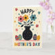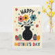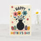 This card features a bright digital illustration with a creamy background and a cheerful, retro-inspired layout. At the top center, the word “HAPPY” appears in large black letters, setting a lively tone right away. Below it sits a rounded black vase dotted with white and multicolored spots, holding three blossoms in soft pink, sunny yellow, and cool teal, with dark green leaves and fine black line details. Small star-shaped flowers and scattered confetti-like dots float around the scene, giving it the feel of a friendly celebration ❤️. Near the bottom, four egg-shaped decorations line up like little keepsakes, their patterns suggesting a shared moment between loved ones. The first is deep red with wavy teal lines, the second teal with yellow waves, the third dark blue with pink stripes, and the fourth bright yellow with black dots 🌼. Along the lower edge, “MOTHER’S DAY” is written in chunky, colorful letters beneath the decorative shapes. The background remains a soft cream while tiny floral bursts and round specks in mixed colors are sprinkled across the open space.