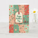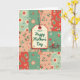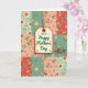 This card features a parchment-toned tag at the center, with softly worn edges and a deep red cord that makes it feel like a little note saved for someone special ❤️. Across the tag, green lettering flows in a gentle, curling style, placed neatly in the middle as the main message. Behind it, the background is arranged in alternating rectangular panels of sage green, warm coral, and deep terracotta red. Each panel is filled with small botanical drawings—daisies, leafy sprigs, tiny blossoms, and scattered heart shapes—that hint at a tender exchange between close friends or sweethearts. The repeated patterns feel cozy and inviting, like a garden quilt laid out for a shared moment. In the lower right corner, a red bicycle adds a quiet romantic touch, as if someone just arrived with a thoughtful surprise 🌼. The bicycle carries a small bouquet in its basket, with little flowers clustered in soft reds and greens.