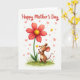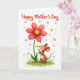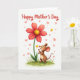 Designed with a bright digital illustration style, the card shows a large stylized flower with five broad salmon-pink petals and a sunny yellow-orange center rising from a slender green stem in a small patch of green grass. Beside it stands a cheerful mouse-like cartoon creature with big round ears and rosy cheeks, posed as if sharing a sweet moment with nature ❤️. One paw is lifted toward a tiny golden-winged insect hovering nearby, while a second little insect floats higher in the open white space, adding a light, friendly sense of company. Across the top, the words “Happy Mother’s Day” appear in flowing red lettering, centered and easy to spot. Pastel pink hearts of different sizes are scattered around the text, drifting across the white background like gentle confetti 🌼. Soft shading under the character and flower gives a bit of depth without making the scene feel heavy. The lower edge fades through layered grassy greens, with the flower rooted slightly left of center and the character tucked close to it.