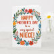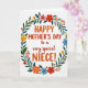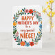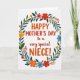 This greeting card features a bright white background with a circular wreath of stylized flowers and leafy sprigs that gently wraps the message like an affectionate hug ❤️. In the center, the main line reads “HAPPY MOTHER’S DAY” in large orange-red letters, giving it a confident, celebratory look. Just beneath it, “to a very special NIECE!” appears in a smaller, flowing style, adding a softer, more tender tone to the dedication. The floral ring mixes red and coral blossoms with sky-blue petals and sunny yellow-orange accents, suggesting a friendly, caring warmth between giver and recipient 🌼. Dark green leaves curl around the circle, with small red-orange berries tucked in like little bursts of closeness. The text stays neatly centered inside the wreath, leaving plenty of open space so the colors feel airy rather than crowded. The flowers have distinct centers and simplified shapes, keeping the overall look modern and easy to read. Around the wreath, the background remains plain white, while the foliage forms a continuous loop with evenly spaced blooms.