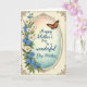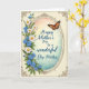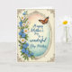 Designed with a luminous oval frame at the center, this card pairs garden details with a soft, affectionate mood ❤️. Along the left edge, white daisy-like blooms and small blue five-petaled flowers cascade downward, with green leaves tucked between them like a gentle bouquet leaning in close. A creamy outer border surrounds the scene, decorated with antique-style curling filigree in a rich bronze tone that feels like a quiet embrace around the artwork. Inside the oval, the background fades from warm peach and pale yellow near the top into cool teal at the bottom, creating a calm, sunlit glow. Near the upper right of the oval, a winged insect rests with orange wings patterned in black and white, adding a lively touch beside the message. The main text sits inside the oval in flowing lettering, colored deep blue so it stands out clearly against the soft wash, with a tender, appreciative tone. 🌼 The bronze filigree traces the border while the flowers remain clustered along the left margin and the orange-winged insect hovers at the upper right.