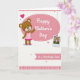 This card shows a sweet illustrated scene in soft pinks, crisp whites, and warm browns, centered on a friendly brown bear with rosy cheeks and a gentle smile ❤️. The bear wears a pink-and-white plaid dress with ruffled fuchsia trim and matching sandals, reaching one paw forward as if inviting a hug from someone close. In the middle, a pastel pink oval with a dashed white outline holds the main text in white, flowing lettering, making it the focal point. A small photo-style rectangle appears to hang from the oval, showing the same bear standing in green grass, like a tender shared memory tucked into the design. Small fuchsia hearts float around the bear and the central oval, adding a quiet romantic touch without overpowering the scene 🌼. Narrow plaid bands in pink and white frame the top and bottom edges, giving the layout a cozy fabric-like feel. Near the lower area, a matching pink banner with another dashed white outline carries a shorter line of text in the same white, flowing lettering. The background stays mostly white, letting the pastel pink oval, the fuchsia hearts, and the plaid borders stand out clearly.