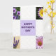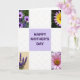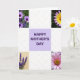 This card features a neat grid layout with a pale lavender square in the center that reads “HAPPY MOTHER’S DAY” in deep purple, set up as the main focal point. Around it, four floral close-ups sit in the corners like a gentle frame, giving the design a caring, close-to-you feel ❤️. In the top-left corner, purple daisy-like flowers with darker centers stand out against leafy green, like a cheerful little bouquet offered with a smile. The top-right corner shows a bloom with petals shifting from sunny yellow to soft lavender at the tips, circling a warm golden-orange center that feels like an affectionate glance. In the bottom-left, deep violet spiky florets rest on a creamy background, adding a calm, quiet tenderness to the mix. The bottom-right corner holds a soft pink flower with layered petals opening outward from an orange-yellow center, like a warm hug 🌼. Wide white grid spaces with faint, subtle patterning separate each panel and keep the flowers and central text visually crisp and easy to take in.