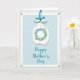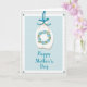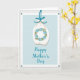This card features a calm, pale blue background framed by a white and light grey border with a delicate, lace-like pattern. Near the top, an off-white pouch-shaped ornament hangs as if floating, held by a teal ribbon tied into a neat bow that feels like a caring gesture ❤️. On the front of the pouch sits a round wreath made of small blue flowers with white centers and thin green leaves, arranged with the kind of closeness you’d see in a gentle hug. A soft shadow beneath the pouch adds depth, making it look lightly suspended over the background. The greeting “Happy Mother’s Day” appears below in flowing teal lettering, centered and easy to notice. Tiny teal studs sit at each corner of the inner blue panel, adding a small glint like jewelry 🌼. The border stays subtle so the ribbon, wreath, and message remain the main focus, and the teal accents repeat throughout for a balanced look. The teal corner studs appear as small round dots against the pale blue panel.