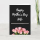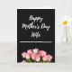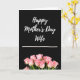 This Mother's Day card features a deep black upper area where the message “Happy Mother’s Day Wife” sits centered in white lettering, standing out with a soft, romantic glow ❤️. A thin golden‑beige line runs horizontally beneath the words, gently dividing the design like a quiet pause between message and flowers. Below, a lush arrangement of blush‑pink rose-like blooms spreads across the bottom edge, their layered petals opening as if leaning toward one another in a tender, close moment. The pink tones stay gentle and warm, creating the look of a loving gesture without needing extra decoration. Fresh green stems and leaves weave through the blossoms, adding natural contrast against the dark background 🌼. The text remains in the top section while the flowers fill the lower third, keeping the layout balanced and easy to read. The final detail is the soft pink bouquet clustered along the bottom border, with green foliage peeking out between the blooms.