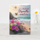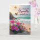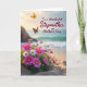 Designed with a seaside scene in mind, this card shows a lush cluster of daisy-like flowers resting on warm, softly rippled sand. Magenta and white petals with sunny yellow centers sit front and center, with small lavender sprigs and tiny golden blooms tucked into deep green leaves for a romantic, just-picked look ❤️. The sand is gently lit with tiny shadows between the grains, giving the arrangement a cozy, close-up feel like someone placed it there for a loved one. Behind the flowers, the ocean stretches out in a soft turquoise wash, with faint, blurred waves sliding toward a calm horizon. The sky blends pale blue with a hint of amber near the edge, like early morning or late evening light. Near the top, a flowing line of text is set in a dark, ink-like color, centered and easy to spot against the lighter sky. Two butterflies lift into the open air above—one golden and one orange with black markings—hovering near the upper right as if drifting together 🌼.