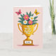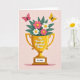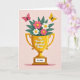 This card features a golden trophy centered on a blush pink background, glowing with a polished look that feels like a loving award for someone special ❤️. From the open top, a bouquet spills out with white and deep pink flowers, each with bright yellow centers, surrounded by stylized green leaves that curl gently like an affectionate embrace. Across the trophy’s main body, a flowing line of lettering appears in a darker contrasting tone, placed neatly to follow the curve of the metal. Near the bottom, a short message sits on a small white plaque on the base, standing out clearly against the gold. The background has a soft texture with faint diamond shapes, adding a cozy, intimate backdrop without pulling focus from the centerpiece. Two butterflies hover nearby—one coral-pink and one sunny yellow—tilted as if circling the flowers in a light, friendly dance 🌼. Soft gradients on the trophy and petals add depth while the overall layout stays balanced and centered. The coral-pink butterfly sits to one side of the trophy while the yellow butterfly floats on the other, both angled toward the bouquet.