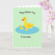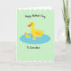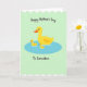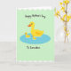 Designed with a calm pastel landscape, this card shows three yellow waterfowl floating together in an oval pool of soft blue, their close spacing suggesting a gentle bond ❤️. A larger adult bird sits in the center with an orange bill and a single orange eye, angled slightly as if watching over the two smaller birds beside it. The two little birds mirror each other on either side, leaning inward so the trio feels connected like close family or dear friends. Behind them, the background is a light mint green that keeps the scene airy and quiet, with wavy white edging along the top and bottom like soft trimming. The simple shapes and flat areas of color keep the focus on their tender, together-at-the-same-pace drift across the water. A short message of appreciation appears in a flowing, handwritten-style font, placed above the pool in a darker shade that stands out against the mint field, with a small accent near it like a tiny 🌼. The pool is an oval of calm azure-blue with a slightly darker outline, centered on the page beneath the text.