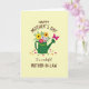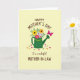 This card shows a dark green watering can with a lighter band around its middle, overflowing with garden flowers on a pale yellow background. Bright yellow blooms, soft white blossoms, and fuchsia and pink petals mix with rich green leaves, like a small bouquet offered with a gentle, caring touch ❤️. Near the spout, a magenta butterfly hovers as if drawn in by the flowers, adding a soft sense of closeness and shared attention. The layout feels balanced, with the fullest cluster centered so your eyes naturally settle on the bouquet. A short line of text sits above the illustration in a deep green color, and a second line appears below in a matching tone, framing the image without crowding it 🌼. Small petals and leaves are scattered beneath the can, echoing the same yellows and pinks as the flowers. The butterfly’s wings are a bright magenta with darker accents along the edges.