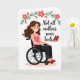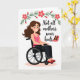 This card shows a smiling woman with warm skin tones and flowing brown hair, seated comfortably in a sleek black mobility chair, her rosy cheeks and relaxed posture giving the scene a caring, close-to-home feel ❤️. She wears a pink top with small dots, dark trousers, and red flat shoes, with her feet resting neatly on the foot supports. Above her, a curved border of red blossoms and soft green leaves adds a gentle, celebratory frame, like a tender bouquet hovering overhead 🌼. On the right side, the main message reads “Not all mother’s wear heels,” set in flowing red lettering that stands out clearly against the white background. Just below and slightly beside the words, a pair of red high-heeled shoes is drawn as a visual counterpoint to her flats, emphasizing contrast through shape and shine. The layout feels balanced, with the figure on the left and the text-and-shoes grouping on the right, creating an affectionate, supportive conversation between image and words. A soft pink ground shape sits beneath the chair, lightly anchoring the woman while the rest of the background remains bright white. The red blossoms form an arc across the top, while the red heels sit to the right of the text near mid-height.