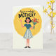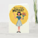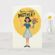 This greeting card features a cheerful woman centered in front of a glowing yellow oval on a soft cream background, creating a cozy, sunrise-like scene ❤️. She has dark bobbed hair, rosy cheeks, and a wide smile, and her raised hand gives a gentle wave that feels like a friendly hello. In her other arm she holds a bouquet of red and orange flowers with deep green stems, adding a romantic, caring touch as if she’s arriving to celebrate someone special 🌼. She wears a simple blue top with white trim and a flowing white skirt decorated with vertical blue stripes, giving the outfit a classic, tidy look. The illustration has a lightly textured, painted feel that makes the colors look soft and layered rather than flat. Across the top, a short message of appreciation appears in dark lettering, centered above her head and easy to spot at first glance. The bright yellow oval sits behind her like a halo of light, with the bouquet angled slightly upward across her torso. The cream backdrop stays uncluttered, with the text at the top and the woman and flowers framed neatly by the yellow shape.