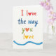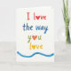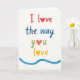 This greeting card features a white background with a friendly, hand-drawn look that feels like a note passed between close partners or dear friends ❤️. Centered on the front, the message reads “I love the way you love” arranged in three stacked lines with generous spacing. The top line, “I love,” is in rich red, and the “o” in “love” is replaced by a small red heart that leans into the word like a quiet kiss. The middle line, “the way,” appears just below in deep blue, guiding the eye downward in a calm, steady rhythm. On the third line, “you” is written in green, followed by “love” marked first with an orange heart and then a final “love” in warm yellow with another heart, like two people echoing each other’s affection 🌼. The letters have soft, brush-like edges, and a faint paper texture shows through, giving the colors a gentle, lived-in feel. Along the bottom edge, a wavy blue line stretches from side to side, lightly framing the text.