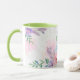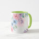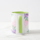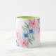This lovely mug has images of pretty pink, lavender, blue and green flowers and accents all around the face of the mug over white background. Sample interior and handle is shown with striking lime green inside. Change to your choice handle/interior color, if desired.