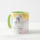 This floral mug has wild flowers with leaves around the top edge of the mug over a white background. Soft Twig save the date text waiting for you to personalize. Sample interior shown is soft lime green. Choose your color interior to suit your taste. Customize this mug or buy as designed.