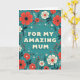 Designed with a teal background, the card centers on large cream-colored text that reads “FOR MY AMAZING MUM,” creating a cozy, affectionate focus ❤️. The words sit prominently in the middle, with a soft shadow underneath that makes them look gently lifted from the page. Around the message, a decorative border of flowers and leafy stems wraps the design like a caring hug, hinting at closeness and gratitude. Coral-red blossoms with eight petals and dark speckled centers mingle with cream-white flowers marked by fine radiating lines and warm red-orange cores, adding a tender, friendly warmth 🌼. Deep teal stems weave between the blooms, dotted with small leaves and tiny berry-like clusters in red and white that feel like little affectionate accents. The colors contrast strongly yet stay soothing, giving the layout a modern folk-art look that feels welcoming and intimate. Subtle shading appears under parts of the lettering and a few floral shapes, enhancing the layered look. The frame is filled with coral-red and cream flowers connected by deep teal stems, with scattered red-and-white dot clusters tucked between the leaves.