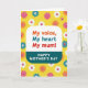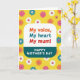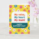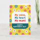 This card features a sunny yellow background filled with a repeating pattern of simple flowers, each with a tiny smiling face at the center, creating a light, affectionate mood ❤️. Across the surface, the blooms alternate in hot pink, bright orange, and soft teal, like a friendly garden that seems to go on and on. In the middle sits a rounded white rectangle that stands out clearly against the busy floral field, giving the design a calm place to rest your eyes. Inside that white panel, the message reads “My voice, My heart My mum!” with the words split across lines in orange, teal, and red lettering. The mix of colors feels like a warm conversation, as if the card is speaking gently and proudly at the same time. Beneath the main message, a dark teal banner stretches across the lower part of the white panel with “HAPPY MOTHER’S DAY” in white, easy-to-read text 🌼. Around the central panel, the yellow background remains packed with evenly spaced flowers, their rounded petals and tiny faces repeating in a neat pattern.