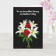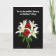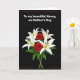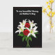 This card shows a classic floral arrangement set on a deep black background, creating a romantic, intimate contrast ❤️. A bouquet sits slightly below the vertical center, mixing white lilies with gently opened petals and green anthers tipped in dark red, alongside two deep red roses with tightly layered petals. Glossy emerald leaves spread outward beneath the blooms, as if cradling them in a quiet, caring embrace. Near the top, a neat line of white text reads, “To my beautiful Nanny, on Mother’s Day,” standing out clearly against the dark space. The lettering is centered above the flowers, leaving comfortable breathing room between the words and the bouquet. The limited palette of white, red, and green feels like a soft exchange of affection, like flowers offered with a lingering glance 🌼. A thin reddish-brown border runs close to the edges, framing the entire design.