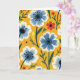 This design shows a repeating garden pattern that feels like two close friends strolling side by side, lingering over every flower ❤️. A warm ochre background sets a sunny scene, while large blossoms in soft blue and crisp white spread across the surface with dark, contrasting centers. Smaller coral-red and warm orange flowers nestle between them, giving the layout the kind of cozy closeness you see in an affectionate pair leaning in. Deep emerald leaves and slender stems weave throughout, creating gentle movement like a shared walk through a meadow. Tiny yellow accents, like fresh buds or drifting pollen, sprinkle around the blooms for extra sparkle 🌼. There’s no visible message text on the front, leaving the artwork to speak for itself. Some of the bigger petals and leaves extend past the edges, suggesting the floral field continues beyond the frame.