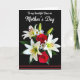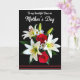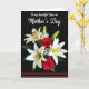 This card features a lush bouquet set against a deep black background, making every petal stand out with dramatic contrast. In the center are elegant white lilies with orange-red centers, nestled beside full crimson roses that lean close like an affectionate pair ❤️. Small white daisies with sunny yellow centers scatter around the larger blooms, adding a gentle, friendly touch 🌼. Deep green leaves and a few slim unopened buds weave through the arrangement, giving it layered texture and a sense of something just beginning. Near the top, white flowing lettering reads, “To my beautiful Oma on Mother’s Day,” standing out clearly against the dark space. Soft lighting skims across the petals and leaves, creating a tender glow and subtle shadows that feel calm and intimate. Along the bottom edge, two thin red horizontal lines sit beneath the bouquet, echoing the roses’ red tones.