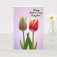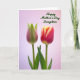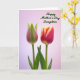Designed with two tall flower blooms rising from the lower edge, this card shows a gentle pairing that feels like close friends leaning toward each other ❤️. One bloom on the left stays mostly closed, with soft blush-pink petals tipped in yellow‑green, while the bloom on the right opens slightly to reveal a deep pinkish-red center edged in warm yellow‑orange. Long green stems and narrow, pointed leaves keep the scene simple and balanced, like two people standing side by side. Behind them, the background fades from a lavender‑pink near the bottom into a very pale pink toward the top, giving everything a calm glow. Near the top, a short Mother’s Day message sits centered in dark green lettering, standing out clearly against the light backdrop 🌼. Soft lighting brings out petal textures, from the smooth, tightly layered bud to the gently folded edges of the opening flower. The two blossoms appear to face inward, as if sharing a quiet moment together. The leaves angle outward in sharp, tapered shapes along the stems.