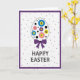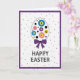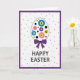 This design shows a spring-themed oval centerpiece on a white background, outlined in soft gray and filled with small, stylized flowers in cerulean blue, rose pink, sunny yellow, and deep violet, each with a contrasting center. Dark circular accents sit between the blooms, giving the layout a modern, graphic look while still feeling gentle and friendly 🌷. A deep purple bow hangs from the bottom of the oval, its balanced loops suggesting the kind of careful touch you’d add when you’re thinking of someone special. A double-lined purple border frames the whole front, echoing the bow color and keeping the composition neatly contained. Across the white space, tiny deep purple polka dots are scattered like confetti, adding light movement without crowding the main shape 🐰. Beneath the centerpiece, the greeting “HAPPY EASTER” appears in uppercase letters in a dark charcoal tone, centered and easy to read. The flowers stay clustered inside the oval while the dots float around the background, creating a calm contrast between structured and airy. The final detail is the symmetrical purple bow directly under the oval, aligned with the centered text below.