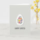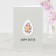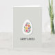 This design shows a white, egg-shaped centerpiece set against a soft, muted gray background, giving the scene a calm springtime setting 🌷. Inside the egg shape, stylized flowers and leaves fill the space like a close bouquet, with blossoms in fuchsia, orange, sunny yellow, and gentle violet. Curving green stems weave between the blooms, and tiny orange and yellow dots scatter around them like confetti, adding a light, friendly energy. The tight spacing of the flowers makes them feel gathered together, like companions leaning in side by side 🐰. A faint shadow under the egg shape adds a slight lift from the background, keeping the layout from looking flat. Near the bottom, a short seasonal greeting sits centered beneath the egg in a casual hand-drawn look, written in a dark gray tone that matches the background. The flowers show rounded petals, small clustered centers, and curling green tendrils contained neatly within the white egg outline.