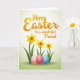 This card features a sunny spring greeting in large, flowing lettering centered near the top, colored in a warm gradient from marigold to amber on a soft off‑white background that fades into gentle green along the bottom edge. The lettering feels like a friendly note passed between close friends, with a welcoming glow that draws your eyes in 🌷. Below the words, three yellow blossoms with deep orange centers stand on slim green stems, arranged in a slight arc as if they’re leaning toward one another. Their curved placement creates a cozy, together feeling, like a small group gathered for a sweet moment. At the base of the flowers sit three smooth oval eggs in pastel pink, deeper fuchsia, and light sky blue, tucked close as if sharing space 🐰. The light green ground beneath them is softly shaded, giving the scene gentle depth without looking heavy. Each egg casts a faint shadow on the green area, and the flower stems rise cleanly above them toward the centered text.