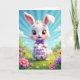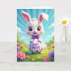 This design shows a white bunny with big ears tipped in soft pink and bright purple eyes, smiling with rosy cheeks and a neat purple bow tie 🐰. The bunny hugs a smooth white egg close to its chest, and its gentle, almost affectionate gaze makes the scene feel like a sweet note shared between close friends. Across the center of the egg, the greeting text sits in violet lettering, surrounded by small purple flower shapes scattered like confetti. Behind the bunny, rolling green hills fade into the distance with rounded shrubs that look soft and welcoming. The foreground is packed with spring flowers in pink, orange, and deep lavender, arranged in layers that add depth around the character’s feet 🌷. Overhead, a bright blue sky sends down pale sun rays that fan out behind the bunny, with a few fluffy white clouds drifting near the top edge. The egg’s violet greeting sits prominently in the middle, framed by tiny purple blooms on the glossy white surface.