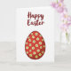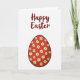 This card features a crisp white background with a single oversized red egg centered like a sweet gift between friends 🐰. The egg has a thin outline that helps it stand out, and its surface is sprinkled with small five‑petaled flowers in soft yellow with teal-blue centers 🌷. The scattered blooms feel like a shared garden moment, as if two people picked them together and tucked them onto the egg with care. Near the top, the words “Happy Easter” sit above the egg in flowing maroon lettering, easy to spot without crowding the design. The deep maroon text echoes the red of the egg, tying the top and center together in a gentle, close-knit way. With lots of open space around the main shape, the layout feels calm and focused, drawing your eyes back to the egg and its floral pattern. The red egg remains the focal point, filled with yellow blossoms and teal centers against the bright white field.