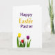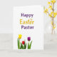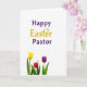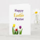 This greeting card features a bright white background with a friendly holiday message across the top, set in flowing lettering that feels like it was written with care. The word “Happy” sits along the upper line in deep purple, with “Easter” centered beneath it in sunny yellow, and the final word placed nearby in matching purple. The letters curve and taper with gentle flourishes, giving the greeting a soft, affectionate tone, like a note shared between close friends 🌷. In the lower third, three tulip-like flowers rise together on green stems, leaning slightly toward one another as if keeping company. The left bloom is yellow, the middle bloom is deep red, and the right bloom is violet-purple, creating a warm, romantic color trio 🐰. Plenty of open space surrounds the design, keeping the focus on the message and the flowers. The trio of blossoms sits neatly at the bottom, with the yellow on the left, red in the center, and purple on the right against the white field.