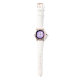 I only have one complaint. I ordered the watch with clear case and strap, and what was sent was white case and strap. I'm going to keep it because 1) it looks very nice in white, and 2) it would take too long to get a replacement made and sent in time for my occasion. Aside from the mix up with the color, the watch does look very good in white. The purple dial is actually sparkly which did not show in the online images. That was a nice surprise. If you like Swatch watches this is very similar to those. It's 33.6mm in diameter, 10.5mm thick, and 40.6mm lug to lug. Stainless steel case back says 3ATM/30m WR, so no swimming or showering or submerging this one. If you like Woodstock, this is a great choice.