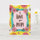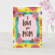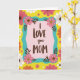 This design shows a sunny yellow background filled with scattered flower shapes in fuchsia, white, and soft orange, creating a cheerful garden feel 🌼. In the center, the message “I LOVE you MOM” sits large and easy to read, written in warm dark brown lettering with “MOM” emphasized at the end. A wavy teal border surrounds the words like a gentle hug, giving the middle area a cozy, close-to-the-heart look ❤️. In each corner of the inner frame, stylized pink blossoms open outward, paired with small deep-brown leaves that add a grounded, natural contrast. Around the edges, extra floral motifs and tiny star-like blooms drift like confetti, adding movement without crowding the main message. The larger pink flowers include fine dotted texture in their centers that catches the eye like a soft shimmer. The final look features a teal wavy frame with pink corner blossoms and dark brown leafy accents over the bright yellow field.