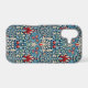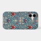 Intricate floral pattern with red, cream, and green leaves on a blue background. Symmetrical design evokes a classic, elegant, and ornate feel.