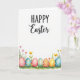 This card features a spring-themed illustration with a wide white area across the top that gives the design plenty of open space. Along the bottom, a grassy border holds seven decorated egg shapes nestled together, like close friends leaning in for a photo 🐰. The eggs show a mix of patterns—tiny flower clusters, neat horizontal bands, and smooth color fades—arranged so they feel connected without looking identical. Colors include soft pinks, bright blues, sunny yellows, and warm oranges, blended in a gentle watercolor look that keeps the scene light and tender 🌷. Thin green blades of grass rise around the eggs, dotted with small blossoms in pink, yellow, and coral that add a soft, affectionate touch to the setting. Near the top, a large hand-lettered greeting sits centered in a deep, dark color, standing out clearly against the white background. The lower edge is filled with green grass and scattered tiny flowers framing the row of seven patterned eggs.