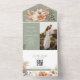 This romantic all-in-one wedding invitation blends soft peach and ivory florals with lush greenery on a sage green background. Designed with space for a personal photo and RSVP card, this envelope-free format is perfect for couples planning a rustic, boho, or garden wedding. Just fold, seal, and send with love—no extra stationery needed.