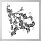 This design features an original illustration of a stylized boho black floral peacock with an elegant tail made up of paisley shapes decorated with flowers.