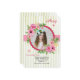 This beautiful, watercolor, round, photo frame with clusters of pink flowers and foliage is backed with a green and white stripe pattern. Perfect for a girl of any age. (<a href='http://www.freepik.com/free-vector/pretty-background-with-watercolor-flowers-for-mother-s-day_1102231.htm'>Designed by Freepik</a>). <br/><br/>The card is easy to customize with your wording, font, font color, paper shape options and choice of six paper types.<br/><br/>Not exactly what you're looking for? All our products can be custom designed to meet your needs at no extra charge.<br/><br/>Simply contact us at askcottonlamb@gmail.com.<br/><br/>Coordinating products available: Just ask us!