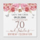 Girly glitter, millennial pink background, with fancy script name typography. Happy 70 and fabulous birthday design template. Pink Roses and butterfly top border. Great for 70th celebrations. Save the date celebration reminder.
