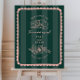 Wedding theme featuring text inside hand drawn pink frame with pink floral botanical line drawing over emerald green stripe background.