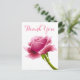 This floral thank you postcard features a hand drawn pink rose flower with raindrops highlighted against a crisp white background with thank you printed in a pink script font.