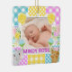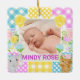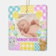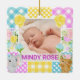 This sweet baby announcement design features a peaceful newborn photo framed by a soft pastel floral‑plaid collage. The patchwork border blends gingham, polka dots, and delicate pattern blocks in pink, blue, yellow, and purple, accented with charming illustrated flowers and adorable character motifs. The mix of textures creates a gentle, handcrafted feel with a warm, whimsical mood. Perfect for birth announcements, nursery décor, or keepsake gifts, this design pairs soft colour, playful details, and heartfelt charm.