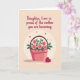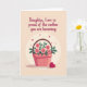 This design shows a soft illustration of a pink basket filled with pale pink flowers and deep green leaves, set on a light peach background that feels calm and caring ❤️. The basket is drawn with simple crisscross lines that give it a textured look, like something carefully arranged for someone special. The blossoms open gently and lean together, creating a cozy, affectionate cluster that suggests closeness and support. Across the upper half, the message “Daughter, I am so proud of the mother you are becoming.” appears in a flowing reddish-brown font, centered and easy to read. A faint cream circle behind the basket acts like a gentle spotlight, helping the flowers stand out without harsh contrast. Small red hearts float around the arrangement like little notes of affection, adding warmth without crowding the scene 🌼. In the bottom right corner, a single deep red heart sits beside the basket.