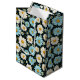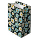 This medium size paper gift bag is shown in a lovely blue and white daisy floral print on a dark color background.