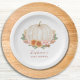 This floral baby shower paper plate is decorated with a watercolor pumpkin, fall foliage, and stylish script typography.
