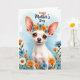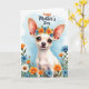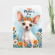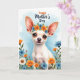 This card features a small puppy with big, shining eyes looking straight out, giving the scene a tender, affectionate feel ❤️. Its pale fur is smooth and softly shaded, while upright ears tinted light pink frame its face like a gentle blush. A flower crown rests on its head, mixing sky-blue and warm orange blossoms with green leaves, as if someone carefully placed it there with fond attention. In the foreground, more flowers and tiny buds cluster around the pup, creating a cozy garden setting that suggests early springtime 🌼. The lighting is soft and diffused, catching a slight gleam on the puppy’s nose and adding depth to the layered petals. Across the top, a short Mother’s Day greeting curves in an arch, set in a medium-to-dark tone that stands out against the light background. Behind everything, the backdrop is a smooth wash of blue with a watercolor-like fade that keeps the focus on the puppy and flowers. The blue background shifts from lighter near the center to deeper toward the edges, framing the floral crown and foreground blooms.