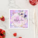 Girly and chic napkins with purple marble rainbow unicorn swirls, a gold floral frame with blue and peach flowers, and a blush pink background. Your custom name and monogram are written in an elegant hand lettered script. You can change the text color and font style and size using the customize option.